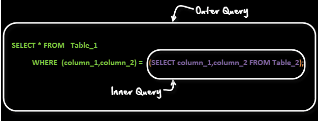 The above is a form of Row Sub-Query. In such sub-queries the , inner query can give only ONE result. The permissible operators when work with row subqueries are [=, >, =, <=, ,!=, ]