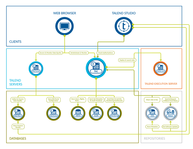 The Clients block includes one or more Talend Studio(s) and Web browsers which uses same or different machines. Talend Studio allows you to perform data integration processes irrespective of the level of data volumes and process complexity.