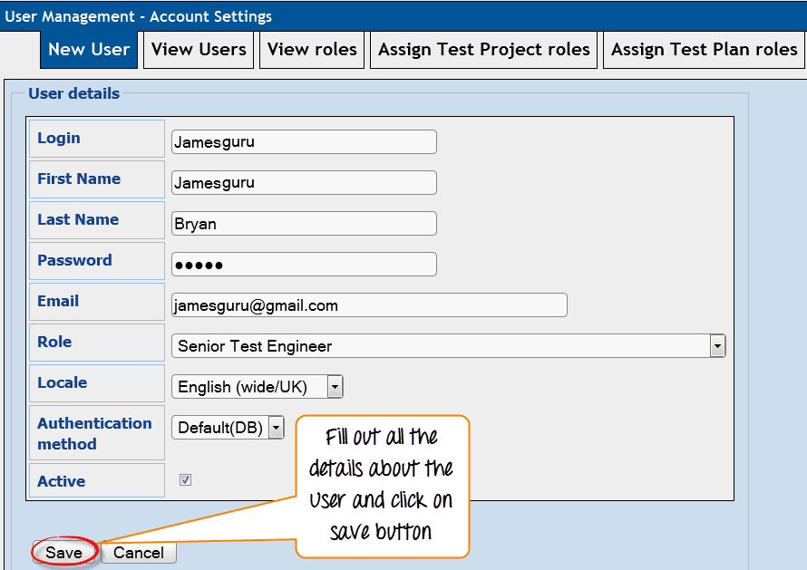 Step 3: Fill out all the users details and click the "Save" button
