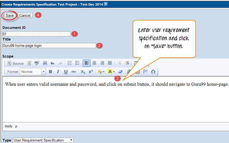 For the type, you can choose the option from the drop-down- here we chose "User Requirement Specification"