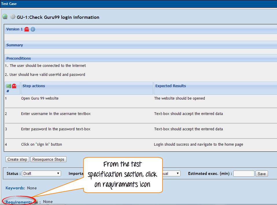Step 1: From the test specification section open any single test case and click on requirement icon