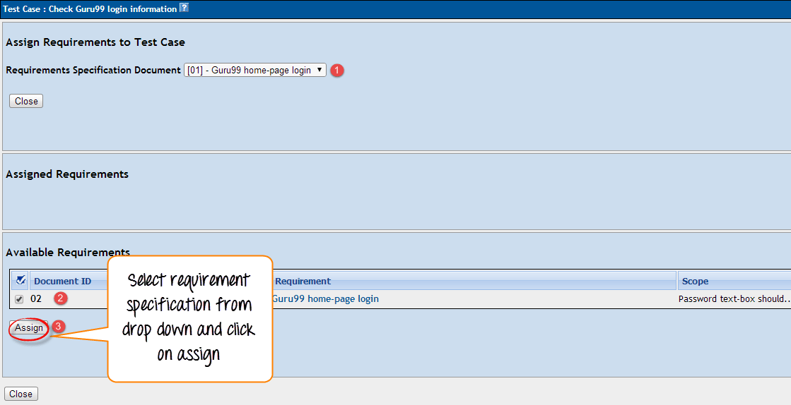 Step 2: To assign requirements specification to test case you have to follow the following steps