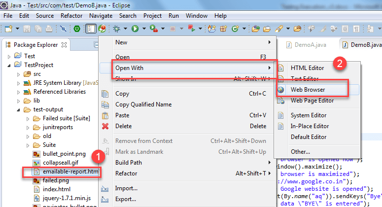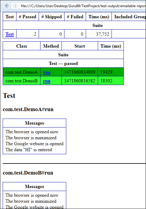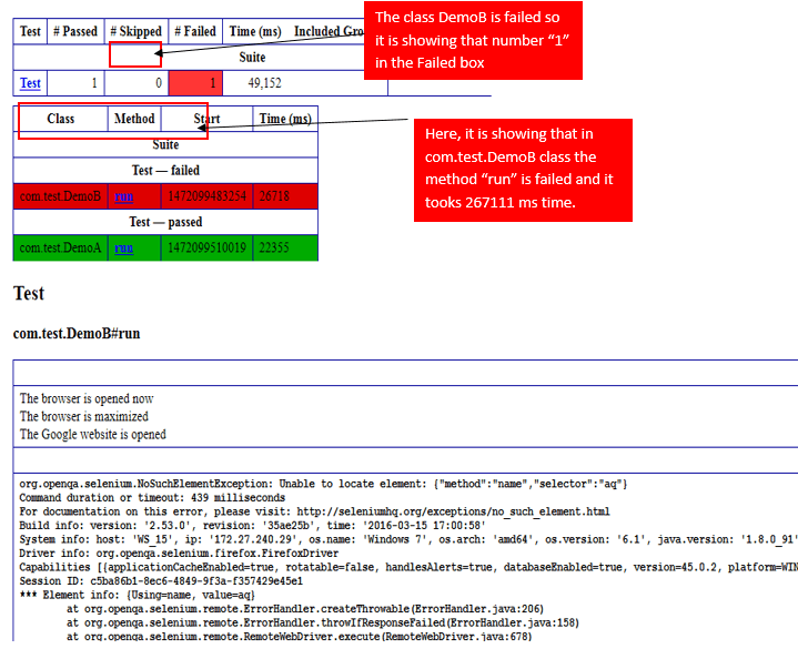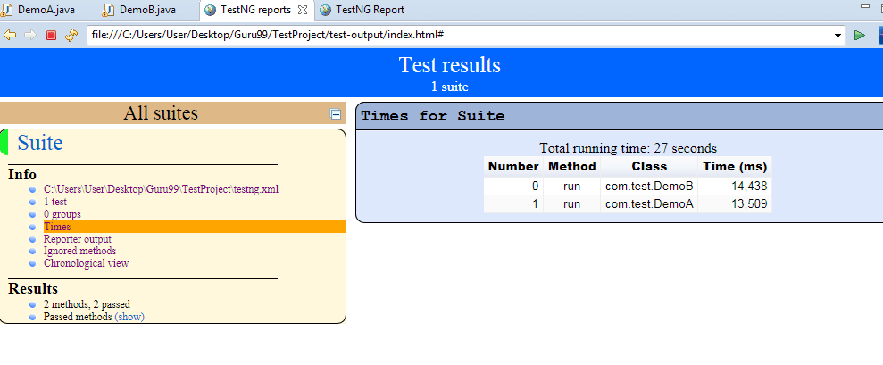 Consider the scenario in where you are intentionally failing the test case i.e. DemoB class. Then convert both the classes into testng.xml suite file and run it. Then the result will look like this. It will show the failed test cases.
