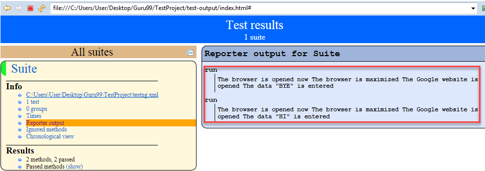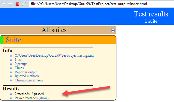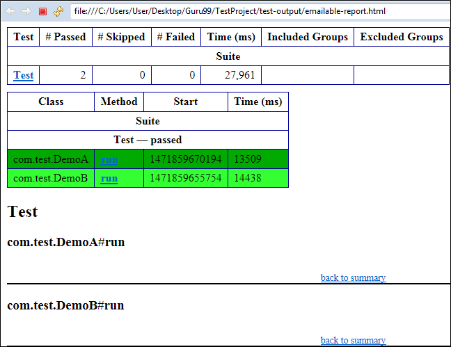 The output report of testng will look like below if both the classes are passed: