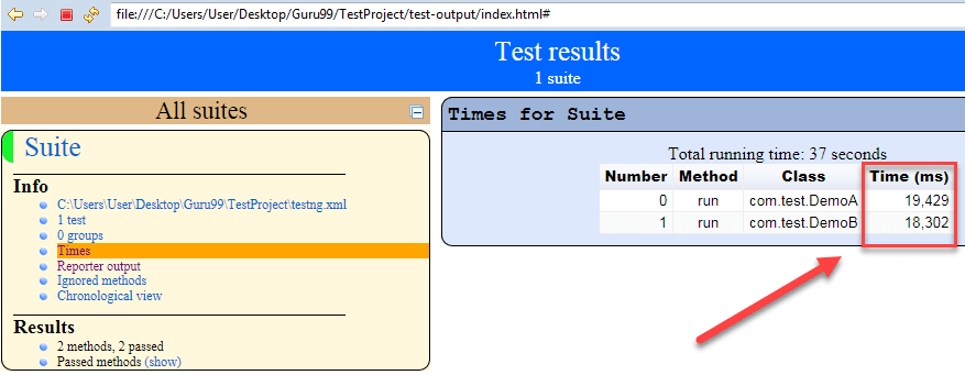 Click on the Times. It will going to show how much time it took to run the test method present in class.
