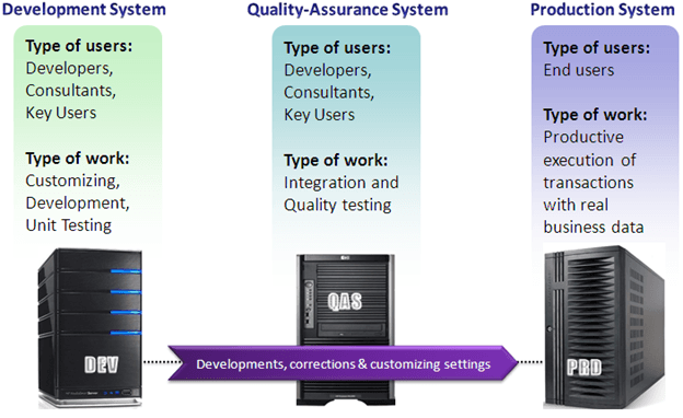 The system landscape (also known as SAP System Group) is the arrangement of SAP servers. Ideally, in a SAP environment, a three-system landscape is recommended. It consists of the