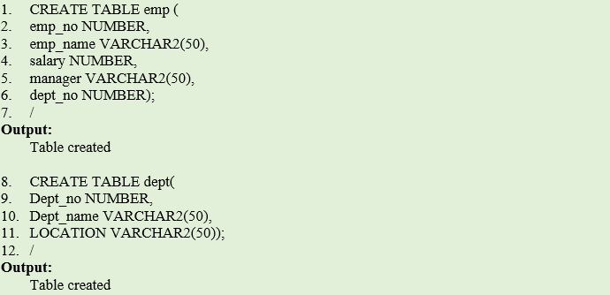 CREATE TABLE emp( emp_no NUMBER, emp_name VARCHAR2(50), salary NUMBER, manager VARCHAR2(50), dept_no NUMBER); / CREATE TABLE dept( Dept_no NUMBER, Dept_name VARCHAR2(50), LOCATION VARCHAR2(50)); /