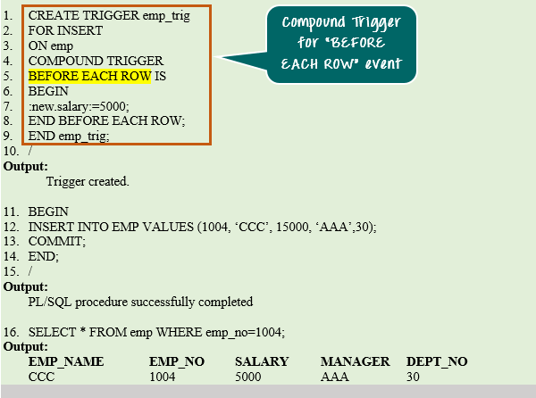 CREATE TRIGGER emp_trig FOR INSERT ON emp COMPOUND TRIGGER BEFORE EACH ROW IS BEGIN :new.salary:=5000; END BEFORE EACH ROW; END emp_trig; /