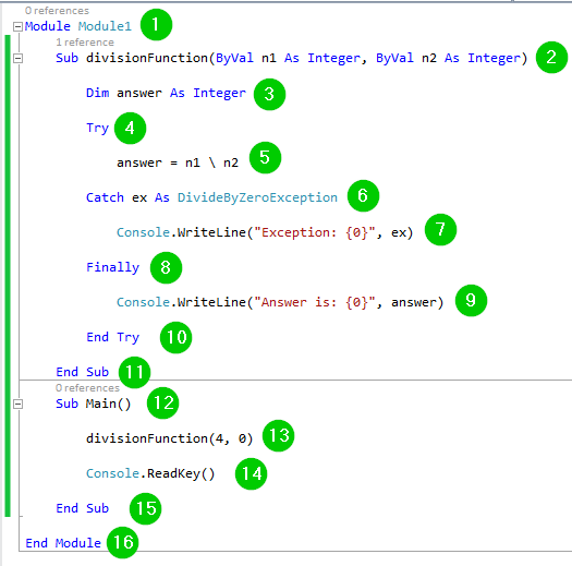 With the Try/Catch statements, you can separate your ordinary program code from the error-handling System. Let us demonstrate how to handle an exception using the Try, Catch, and Finally keywords.