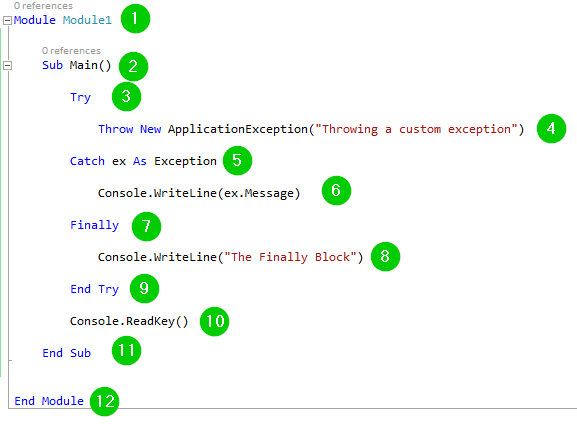 With exceptions, you can transfer the control of a program from one part to another. In VB.NET, exceptions are handled using the following 4 keywords: