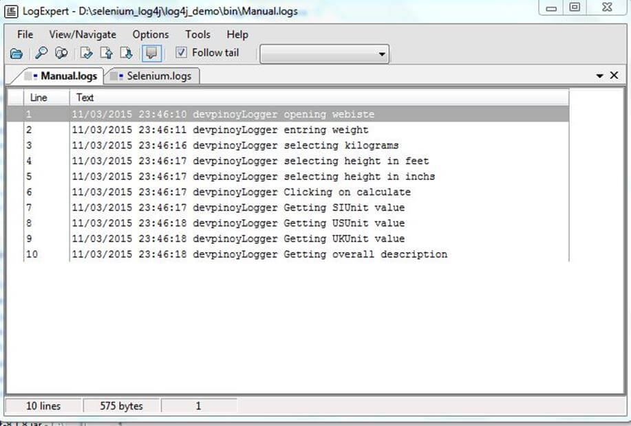 Selecting follow tail option enables tailing of logs which means LogExpert automatically updates the log file when script is in execution phase. If we use any other editor like notepad then we have to close and reopen the file again and again to update the logs. But with ExpertTool in Follow Tail Mode this is not required.