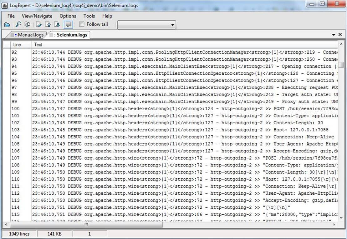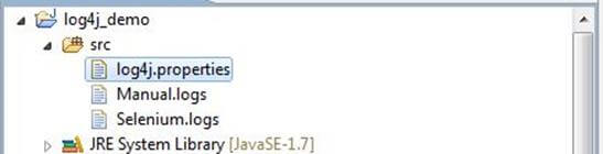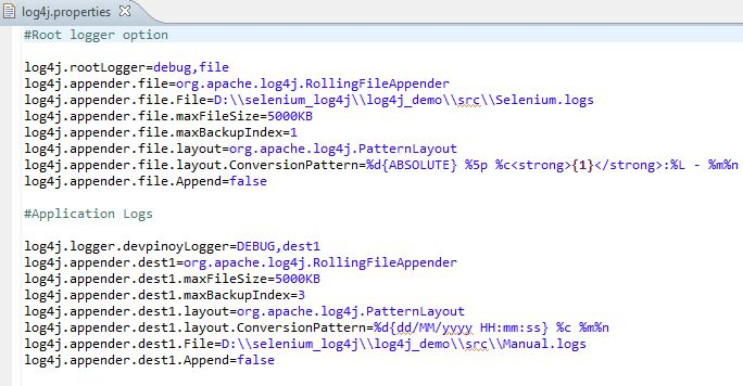 In the above Example, we have configured log4j to log in two different files named as Selenium.log and Manual.log.
