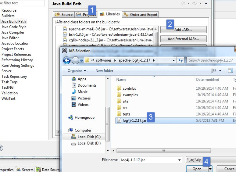 Step 2) Click on Libraries and Add Log4J Library . You can download it from https://logging.apache.org/log4j/1.2/download.html