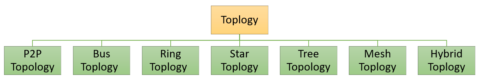 Type of Network Topology: Bus, Ring, Star, Mesh, Tree, P2P, Hybrid