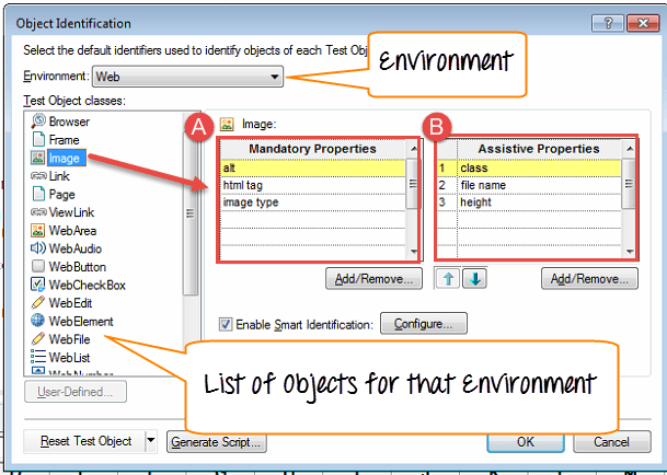 You can select an environment and QTP auto-populates list of all the supported objects belonging to that environment. On the right QTP lists the properties that will be stored for the object. The list is divided into