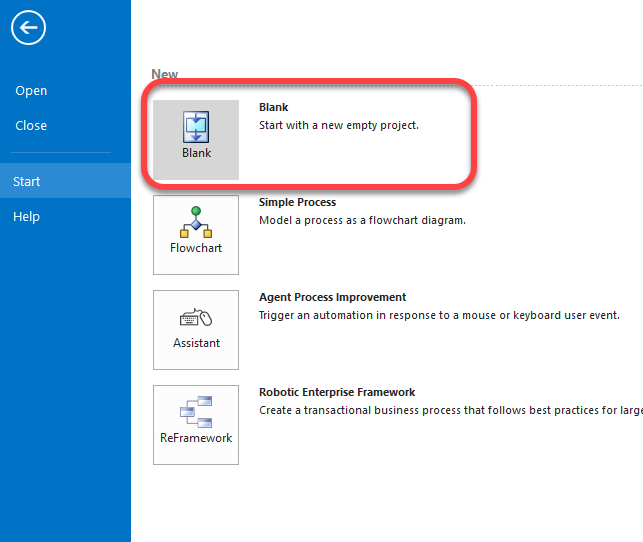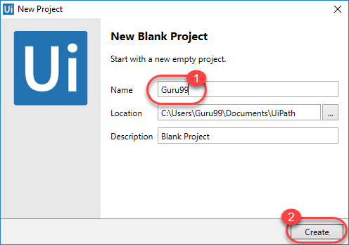 1. Start β It helps in to create any new project or to open a previously created task. By default, all the projects are created in C:\Users\Username\Documents\UiPath.