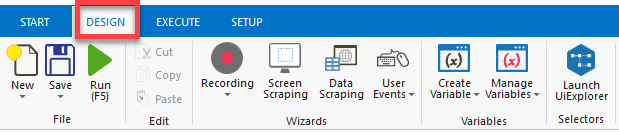 2. Design β It offers all the options to create or launch any sequences, flowcharts or, access wizards and, manage variables.