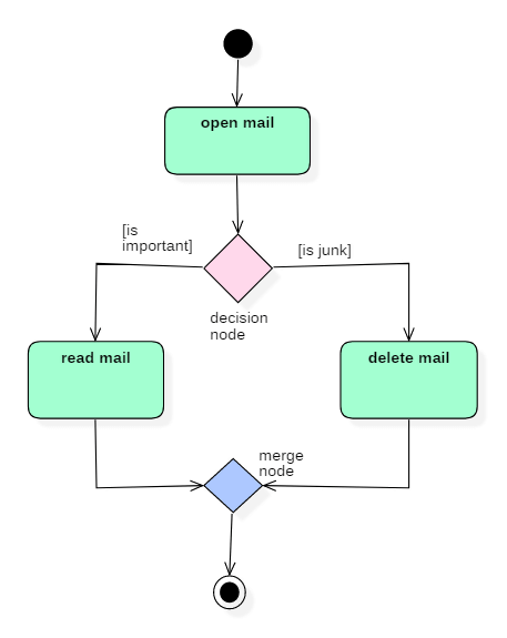 In the above activity diagram, three activities are specified. When the mail checking process begins user checks if mail is important or junk. Two guard conditions [is essential] and [is junk] decides the flow of execution of a process. After performing the activity, finally, the process is terminated at termination node.
