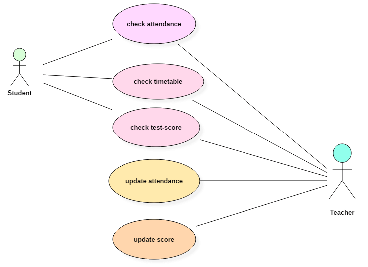 The second actor named teacher can interact with all the functionalities or use cases of the system. This actor can also update the attendance of a student and marks of the student. These interactions of both student and a teacher actor together sums up the entire student management application.