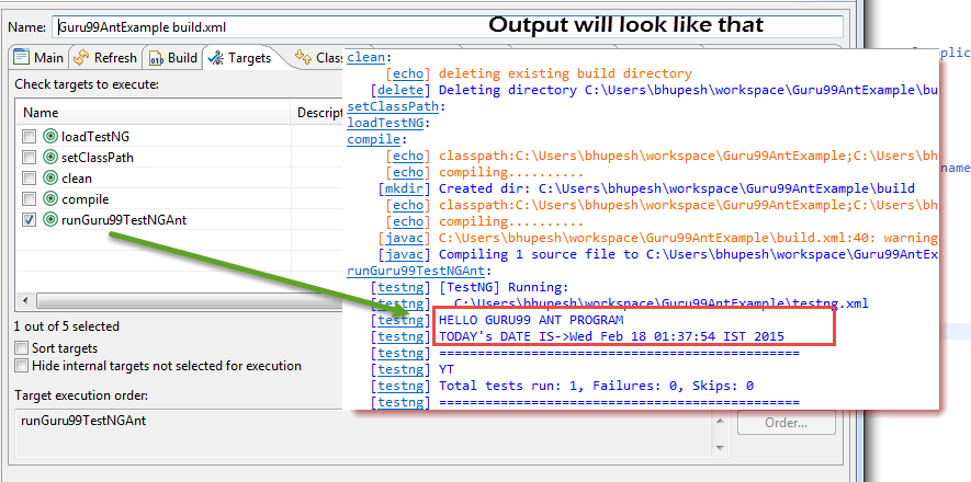 Here we will create a class with Testng methods and set class path for Testing in build.xml.