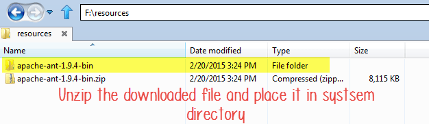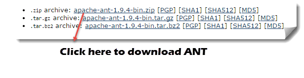 Step 1) Go to http://ant.apache.org/bindownload.cgi Download .zip file from apache-ant-1.9.4-bin.zip