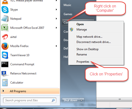 Step 3) Go to Start -> Computer -> right click here and select 'Properties' then click on Advanced System Settings