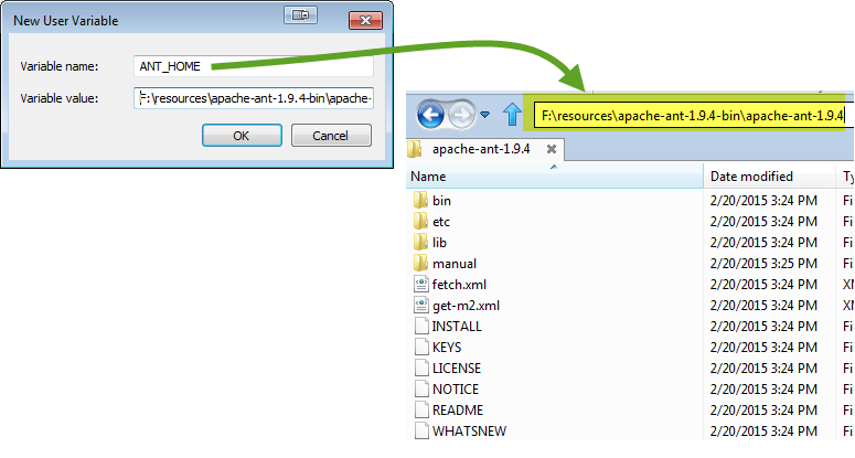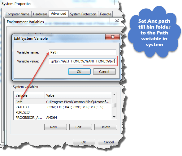 Step 6) now select 'Path' variable from the list and click 'Edit' and append; %ANT_HOME%\bin.