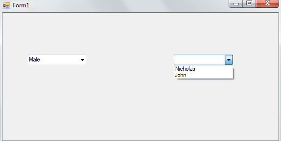 Step 5) Click the dropdown button on the first combobox and choose Male. Move the mouse cursor to the second combobox and click its dropdown button. See the available items: