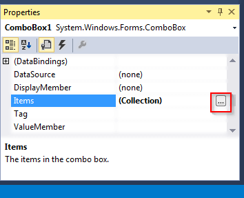 We can also choose to add items to the combobox at design time from the Properties window. Here are the steps:
