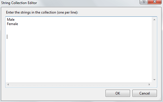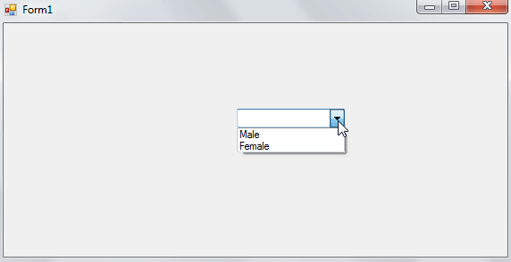 To add an item to a combobox control, we use the Items property. Let us demonstrate this by adding two items to the combobox, Male and Female: