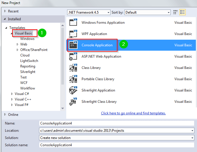 Step 2) On the new window, click Visual Basic from the left vertical navigation pane. Choose Console Application.