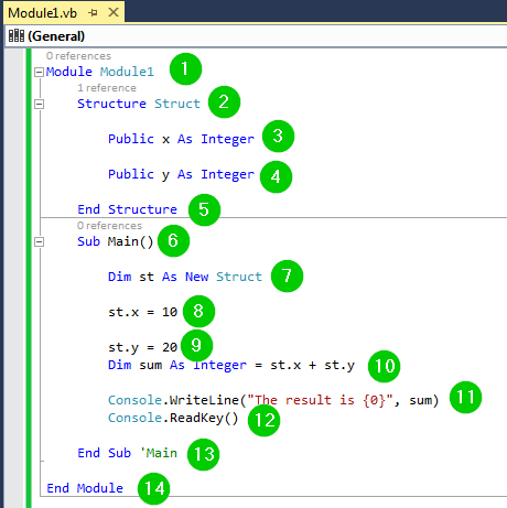 A structure is a user-defined data type. Structures provide us with a way of packaging data of different types together. A structure is declared using the structure keyword. Example to create a structure in VB.NET: