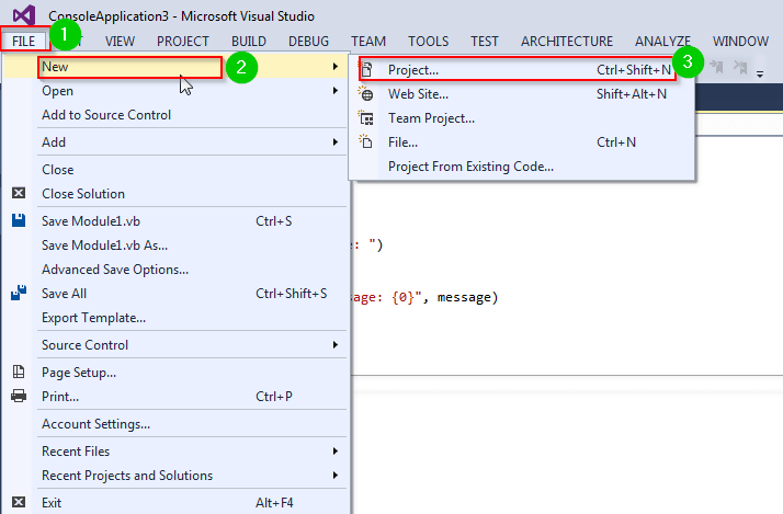 Step 1) Open Visual Studio, and click the File menu, Choose New then Project from the toolbar.