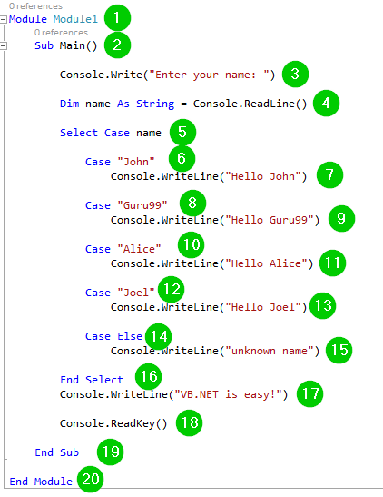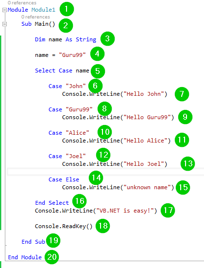 Select Case is a conditional statement, that helps you test a variable for equality against a set of values. Each value is referred to as a case, and a variable that is being switched on should be checked for all the select cases.