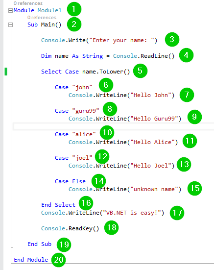 Code line 5: The value of the variable name will be used for performing comparisons with the various Case statements to find a match. The ToLower() function will ensure that any name the user types is first converted into lowercase before the evaluation of Case statements. This means that if the user types gtupapers, it will be immediately converted to gtupapers, then the evaluation of the Case statements is done. If the user types John, it will be immediately be converted to john before the evaluation of the Case statements is done.