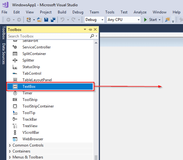 Step 1) To create a TextBox, drag the TextBox control from the toolbox into the WindowForm: