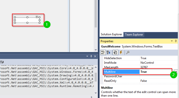 Click the text box control again and move the mouse cursor to the Properties section. Change the value of Multiline property to True.