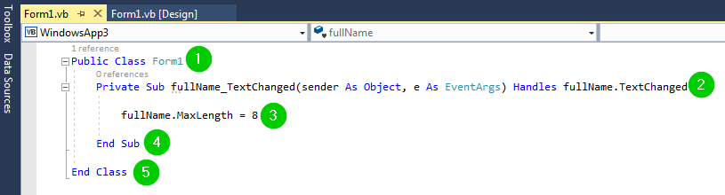 The MaxLength property can help you set the maximum number of words or characters that the textbox will allow. To demonstrate this, create a TextBox control and give it the name fullName. Add the following code: