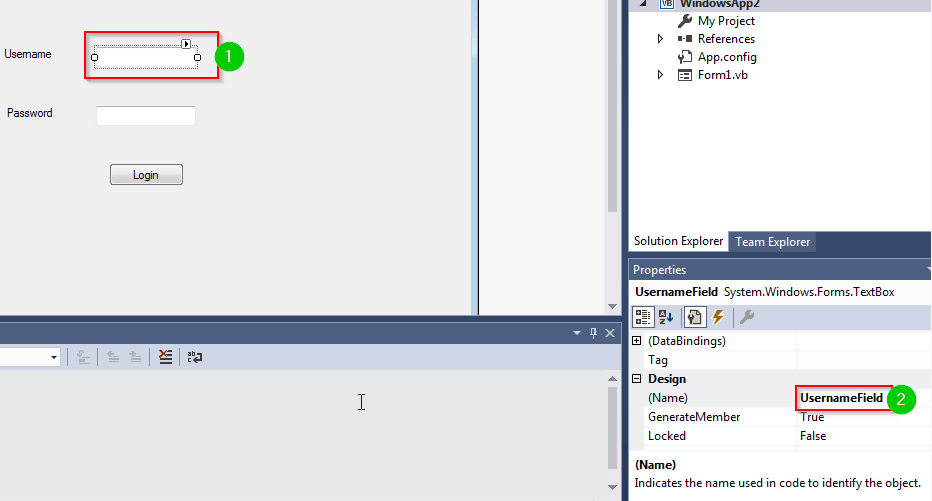 Click the text box next to Username label, move to the Properties section located at the bottom left of the window. Give it the name UsernameField.