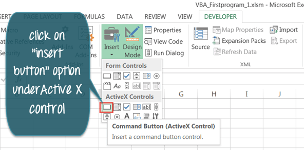 Step 1) In this step, click the option "insert button" from the Active X Control. Then select the command button option from it.