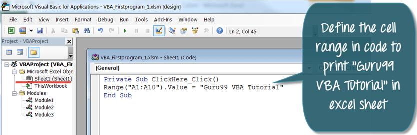 Step 2) To insert "clickcommandbutton1" drag the mouse cursor to Excel sheet.