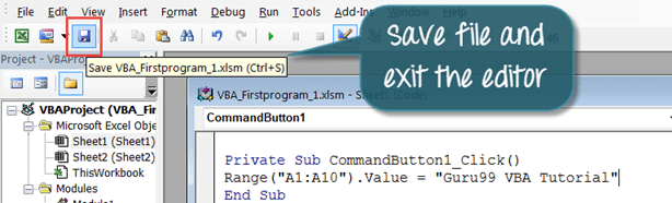 Step 5) In next step, save code file and then exit the editor. To return to the Excel file click the Excel sheet icon