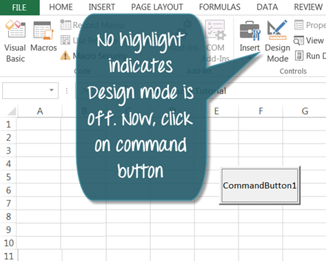 Step 6) In Excel sheet, you will see Design Mode tab is on. Make sure it is "OFF" or else your code will not work.