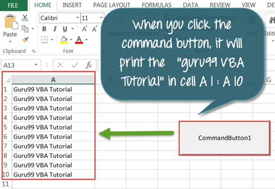 Step 8) Click on "CommandButton1". It will print "gtupapers VBA Tutorial" in the cell range "A1 to A10".