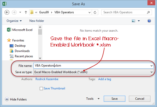 Now, rename sheet1 to "VBA Operator" as shown in screen-shot below. Save the workbook in an Excel Macro-Enabled Workbook (*.xlsm) file extension. (see the image below).