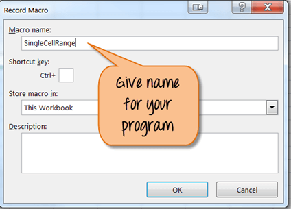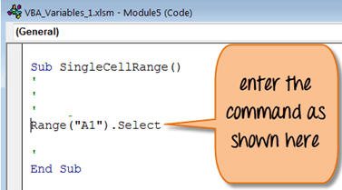 from the top menu. It will open the window below.Step 4) The above step will open VBA code editor for file name "Single Cell Range". Enter the code as shown below for selecting range "A1" from the excel.