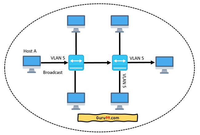 In case if you place interfaces on both switches into separate VLAN, a broadcast from host A can reach only devices available inside the same VLAN. Hosts of VLANs will not even be aware that the communication took place. This is shown in the below picture: