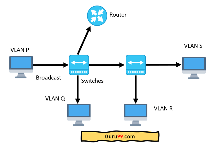 Step 4) VLAN P that needs to get to a computer on VLAN Q (or VLAN R or VLAN S) must travel from the switch to the router and return to the switch.
