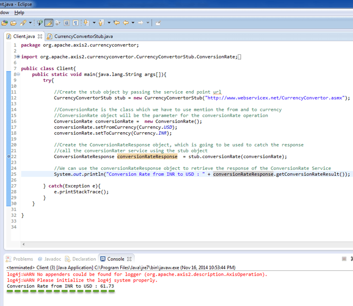 Step g) Create a new Java class (ex : Client.Java) and instantiate stub object. Using the stub object we can call all the supported methods of the particular WebService.