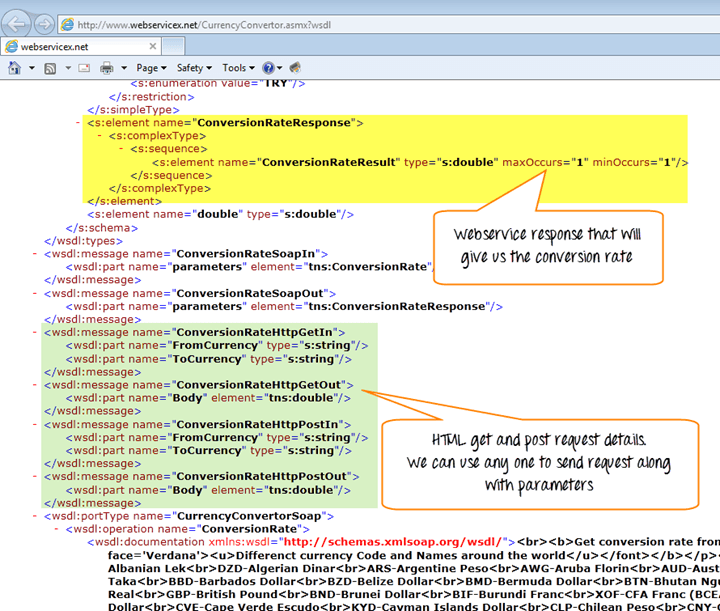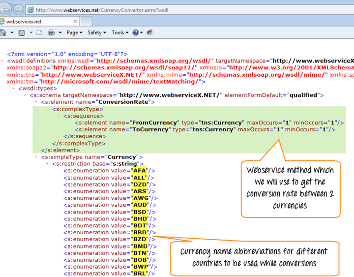 Currency Convertor WSDL file can be seen @ (http://www.webservicex.net/CurrencyConvertor.asmx?wsdl) which will give the information about the Currency Convertor web service methods which it will support, the parameter which we need pass and the type of parameters… etc